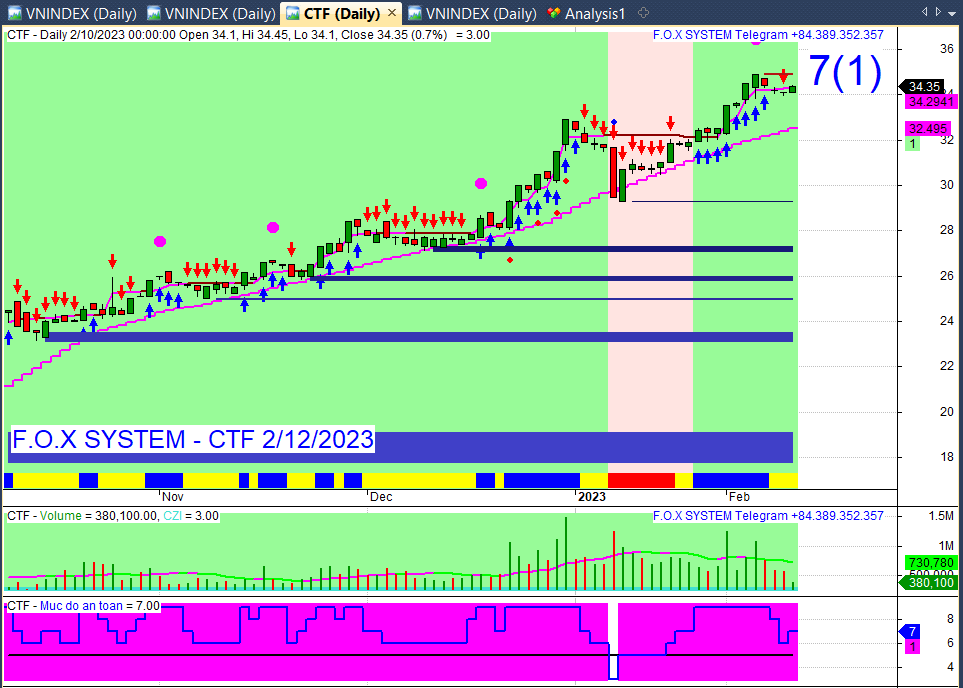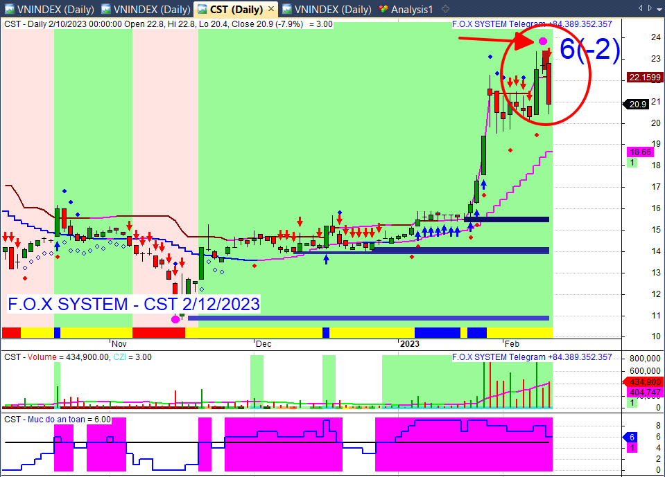 CST. Có chấm màu tím báo phân kỳ đảo chiều giảm. Hình thành kháng cự ( hay vùng cung mạnh). Tín hiệu nên bán