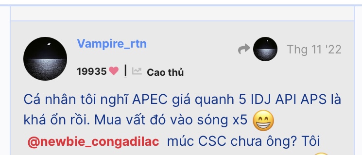 Đây nhịp đó nhắc công khai pic kia với bác Newbie tôi đánh APS giá 5.4 còn Newbie đánh IDJ CEO. Nay Vam còn hàng Aps lô đầu. Hôm qua mua tiếp lô 2 giá 14.4 là cất tủ thứ 2. Bác @newbie_congadilac đi săn đâu mất rồi lâu k xuất hiện