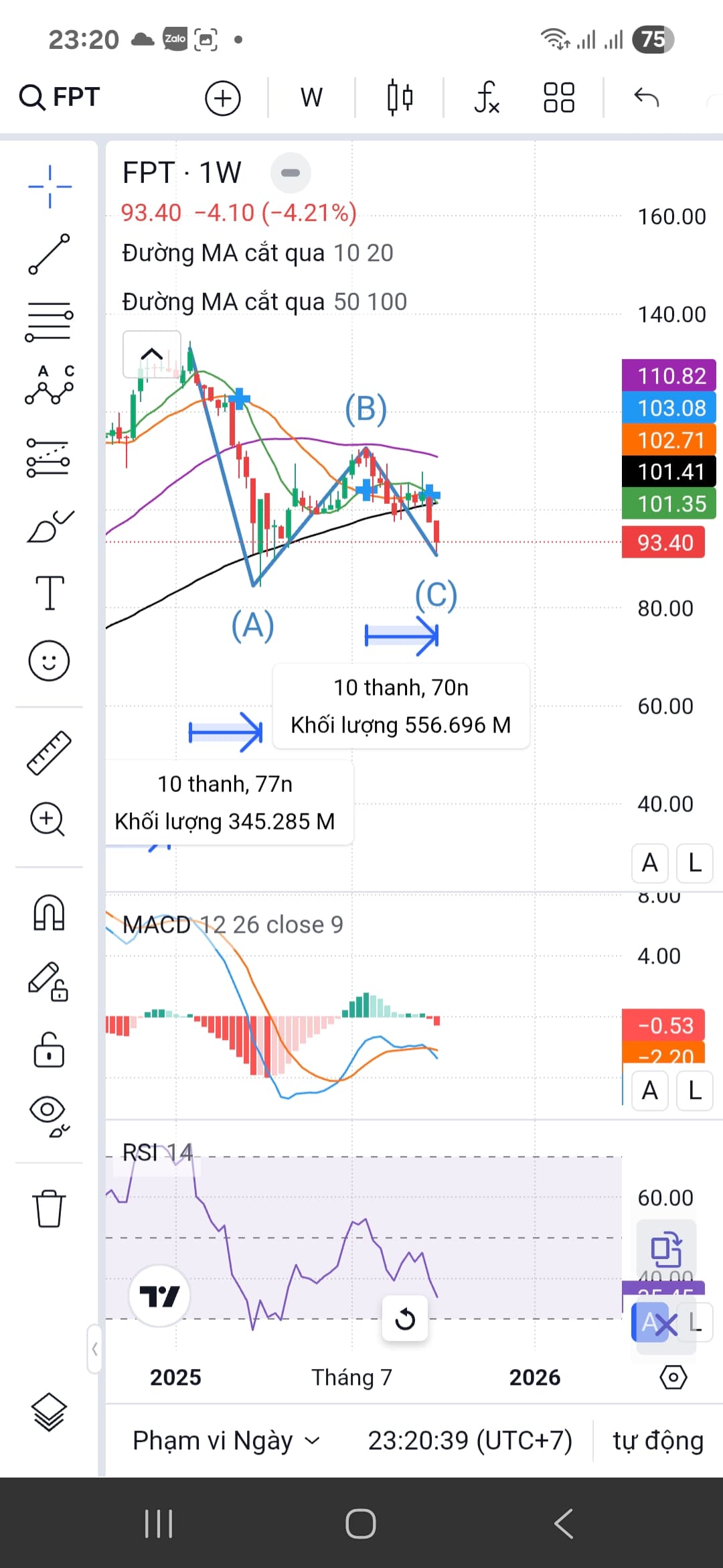 Tính timing và cấu trúc sóng thì tuần này hoàn toàn đủ cho pha điều chỉnh nhịp 2 của fpt. Cũng xác định ra bctc q3 xấu hay tốt đều mua và nếu 8x thì là điểm dài hạn đep nhất. Có thể mua 1 ít lấy vị thế dần vì cũng chưa chắc bctc q3 sẽ tệ. Tóm lại đáy của nó quanh đây