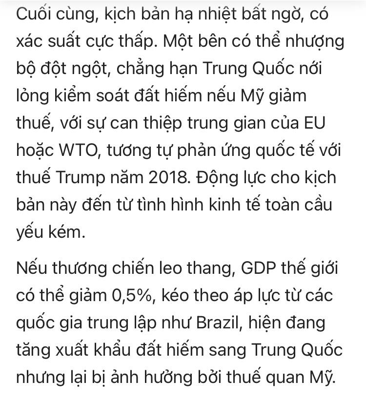 Không nên đánh giá thấp động thái đánh thuế lần này của Trump. Chiến tranh thương mại Mỹ Trung 2018-2019 là cơn địa trấn toàn cầu. Nếu nó xảy ra lần nữa thì hậu quả ko kém phần nghiêm trọng… Chúng ta có thể chủ quan cho là sự kiện này giống tháng 4 và nghĩ rằng nó sẽ nhanh chóng qua đi, nhưng Trump tính khí thất thường, quay xe liên tục, rất khó lường, ai biết đâu lại có một thiên nga đen nữa.