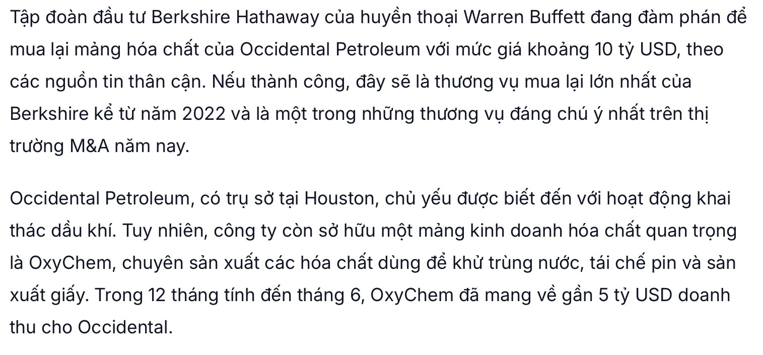hoá chất cũng là 1 mảng khá thú vị nhịp tới, dành cho ai quan tâm: cá mập giàu sụ Buffett chuẩn bị giải ngân tiền cho thương vụ khủng