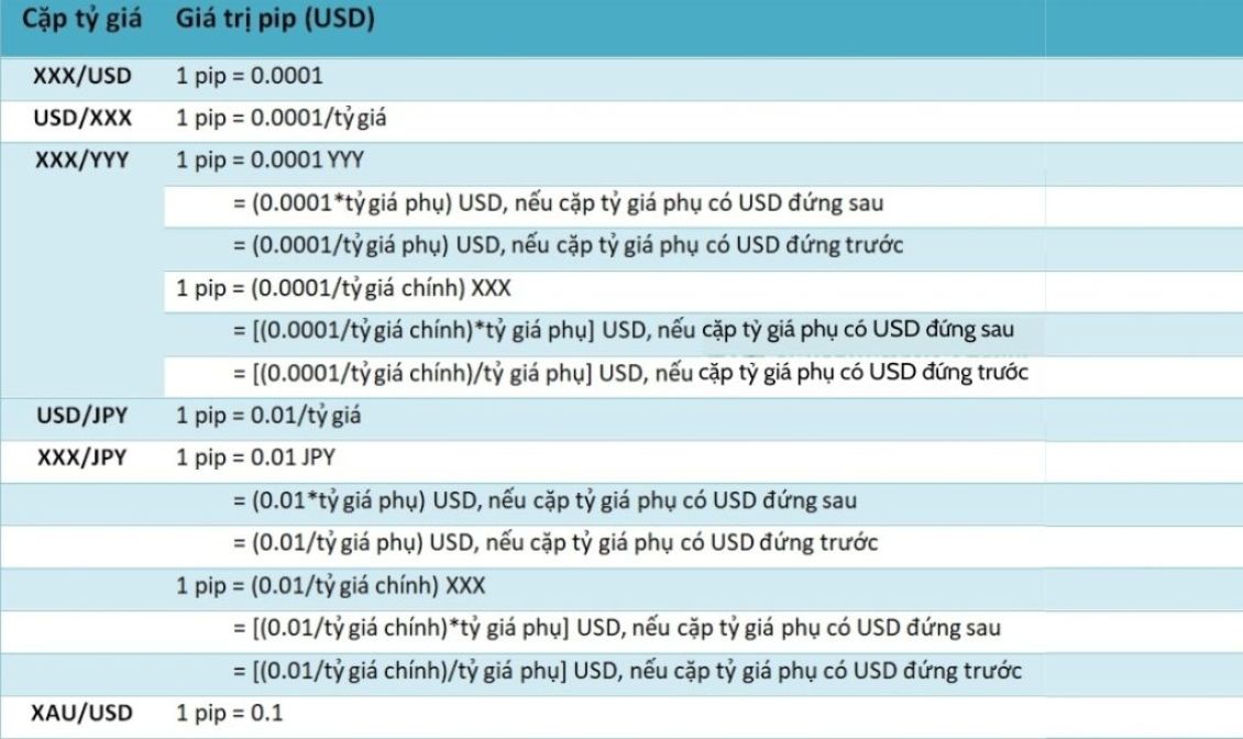 Dưới đây là một số ví dụ về giá trị của Pip cho các cặp tiền tệ phổ biến: