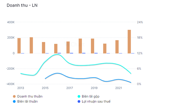 Về kết quả kinh doanh năm 2022, tổng doanh thu hợp nhất đạt 304.000 tỷ đồng, tăng 79,8% so với con số thực hiện năm 2021. Lợi nhuận trước thuế đạt 2.260 tỷ đồng, giảm 40% so với con số thực hiện năm 2021. Tuy nhiên, nếu so với kế hoạch đề ra sau điều chỉnh thì lại hoàn toàn vượt xa con số trong cuộc họp bất thường ngày 6/12. ( Hình 3)