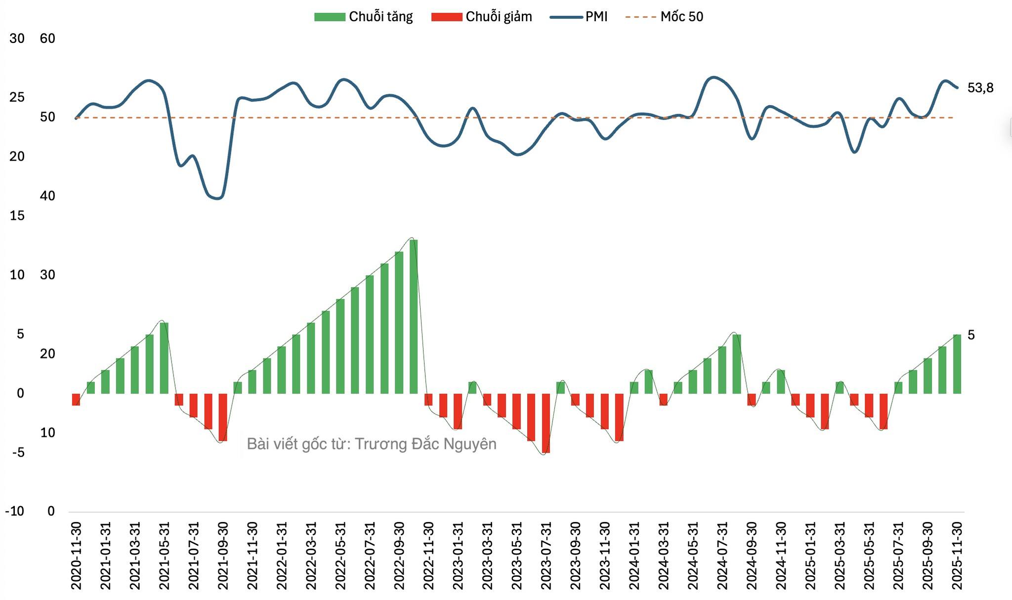 Tháng 11 vừa rồi PMI đạt 53,8 cao hơn ngưỡng 50 rõ rệt, cho ta biết thấy điều kiện kinh doanh tiếp tục đang cải thiện dần. Đặc biệt hơn đây chuỗi tháng cải thiện đã kéo dài đến 5 tháng liên tiếp (tháng 7 đến tháng 11/2025) cho chúng ta nhiều kì vọng sản xuất kinh doanh sẽ cải thiện mạnh mẽ hơn từ đầu năm 2026 tới.