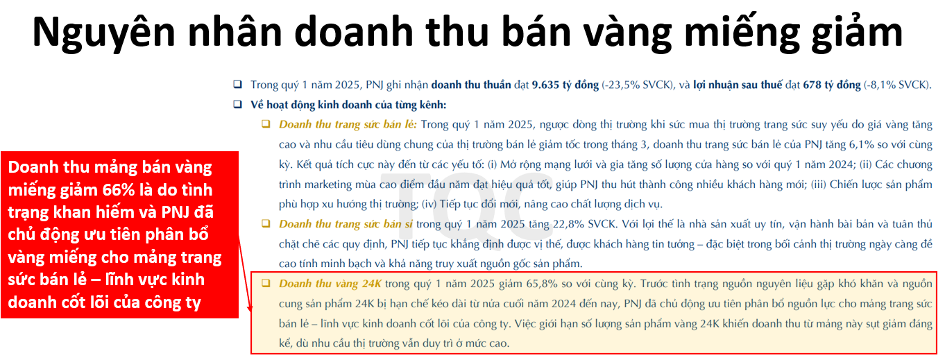 Trong Q1/2025, doanh thu của PNJ đạt 9.635 tỷ, giảm 23% so với cùng kỳ, điều này là do doanh thu mảng bán vàng miếng giảm 66%.