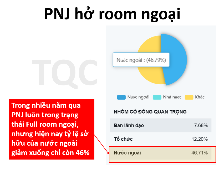 Trong nhiều năm qua PNJ luôn trong trạng thái full room ngoại, nhưng hiện nay tỷ lệ sở hữu của nước ngoài tại doanh nghiệp giảm xuống chỉ còn 46%, điều này chứng tỏ một phần NĐT ngoại đã rời bỏ doanh nghiệp và không còn quá lạc quan vào triển vọng kinh doanh của PNJ trong 2025.