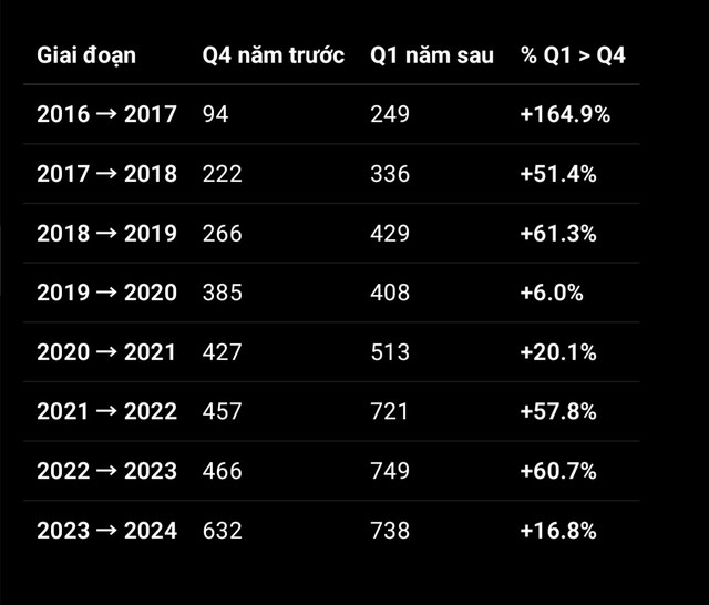 Quy luật lịch sử (2017–2024): Q1 cao hơn Q4 ~39–40%