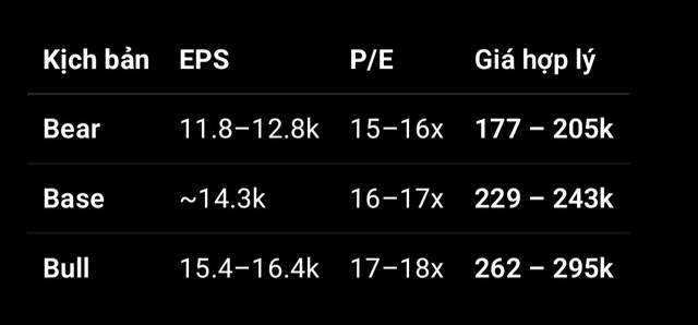 Nội suy ra LNST 2026 ~4.9k tỷ, EPS ~14.3k → giá hợp lý trước chia ~230–240k ở P/E 16–17x.”
