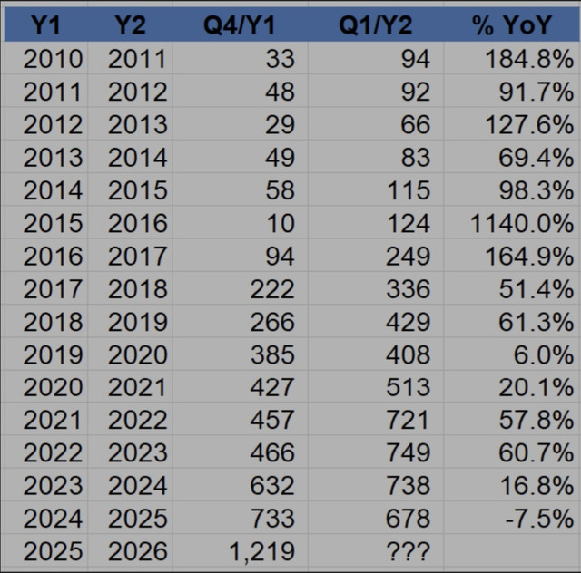 Q1 thường cao hơn Q4 liền kề 40–55%, không phải cảm giác. - Năm 2025 là ngoại lệ hiếm
