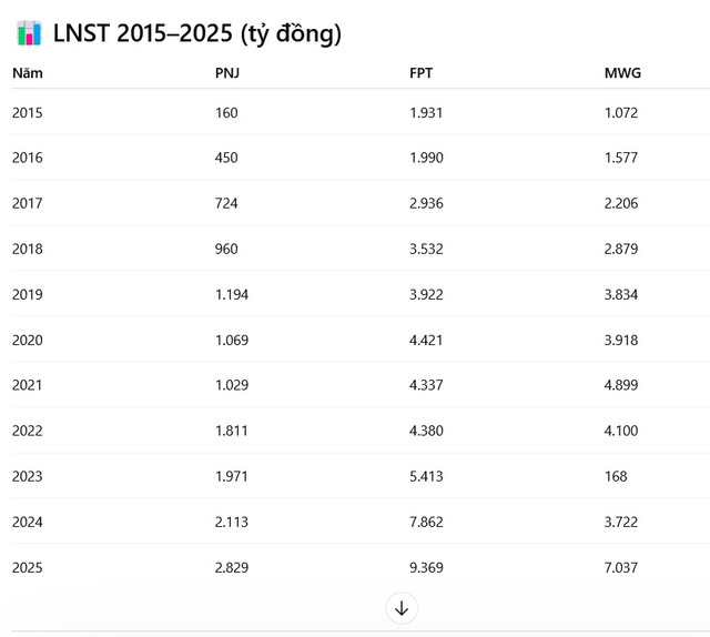 - Trong 10 năm qua, PNJ tăng lợi nhuận từ 160 tỷ (2015) lên 2.829 tỷ (2025) – tương đương CAGR khoảng 33%/năm.