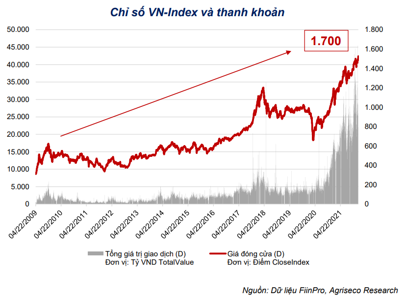 Từ đây, Agriseco Research dự báo chỉ số VN-Index năm 2022 có thể chạm mốc 1.600 - 1.700 điểm. Dòng tiền mạnh mẽ tiếp tục chảy vào thị trường chứng khoán, số lượng tài khoản mở mới tiếp tục tăng mạnh trong năm 2022. Đồng thời, triển vọng nâng hạng lên thị trường mới nổi, ra mắt các sản phẩm mới như T0, phái sinh, bán khống.