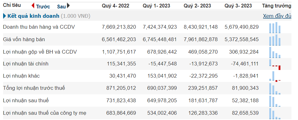 Lợi nhuận sau thuế của công ty mẹ trong Quý 3-2023 là 82 tỷ VNĐ, tăng so với các quý trước nhưng vẫn thấp hơn mức 126 tỷ VNĐ trong Quý 2-2023.