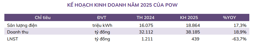 ➢ Năm 2025, POW dự kiến sẽ tổ chức thực hiện đại tu Nhà máy điện Hủa Na; tiểu tu các Nhà máy điện Cà Mau 1, Nhà máy điện Nhơn Trạch 2, Nhà máy điện Đakđrinh. Hoàn thành đàm phán, ký kết hợp đồng GSA với PV GAS về việc cung cấp nhiên liệu khí LNG cho công tác vận hành thương mại tại Nhà máy điện Nhơn Trạch 3&4. POW dự kiến sẽ đưa dự án tòa nhà văn phòng tổng công ty vào vận hành trong năm. Đồng thời, tiếp tục phối hợp với tập đoàn bám sát các cấp có thẩm quyền để sớm hoàn thành công tác quyết toán cổ phần hóa PV Power, tăng vốn điều lệ của công ty mẹ - PV Power. Bám sát cấp có thẩm quyền hoàn thành quyết toán dự án NMĐ Vũng Áng 1.