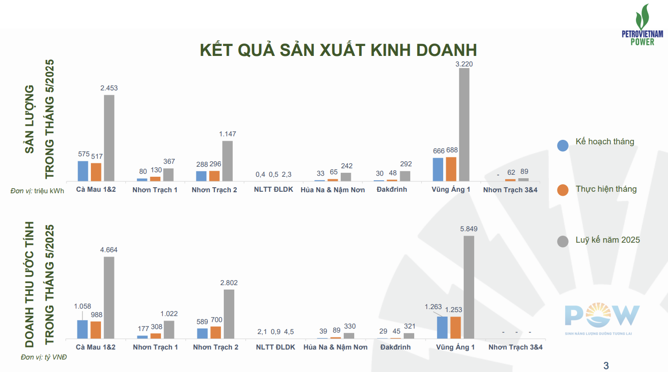 Trong tháng 5, sản lượng điện từ các nhà máy của PV Power đạt khoảng 1.807 triệu kWh, mang về doanh thu ước tính 3.384 tỷ đồng. Tính chung 5 tháng đầu năm, tổng doanh thu từ bán điện đạt gần 14.993 tỷ đồng.