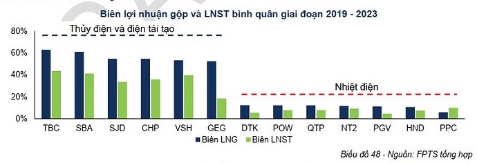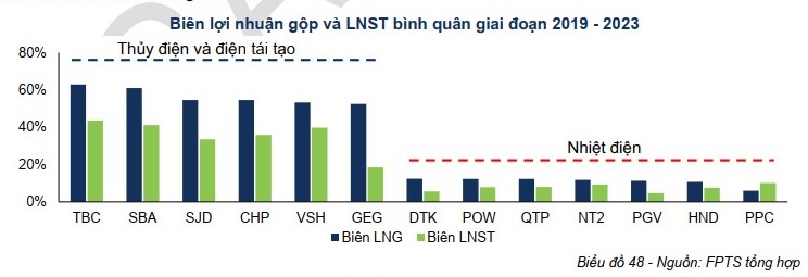 Tuy nhiên, kết quả kinh doanh của nhóm nhiệt điện còn chịu ảnh hưởng từ nhiều yếu tố khác như: diễn biến giá nhiên liệu, thay đổi giá hợp đồng và biến động giá trên thị trường cạnh tranh. Biên lợi nhuận gộp của nhiệt điện thấp hơn đáng kể, chỉ vào khoảng 5 – 15% và biên lợi nhuận sau thuế thường dưới 10%. Trong khi, các doanh nghiệp thủy điện và năng lượng tái tạo đều có tỷ suất lợi nhuận rất cao, với biên lợi nhuận gộp khoảng 50 - 70% và biên lợi nhuận sau thuế từ 30 – 50%.