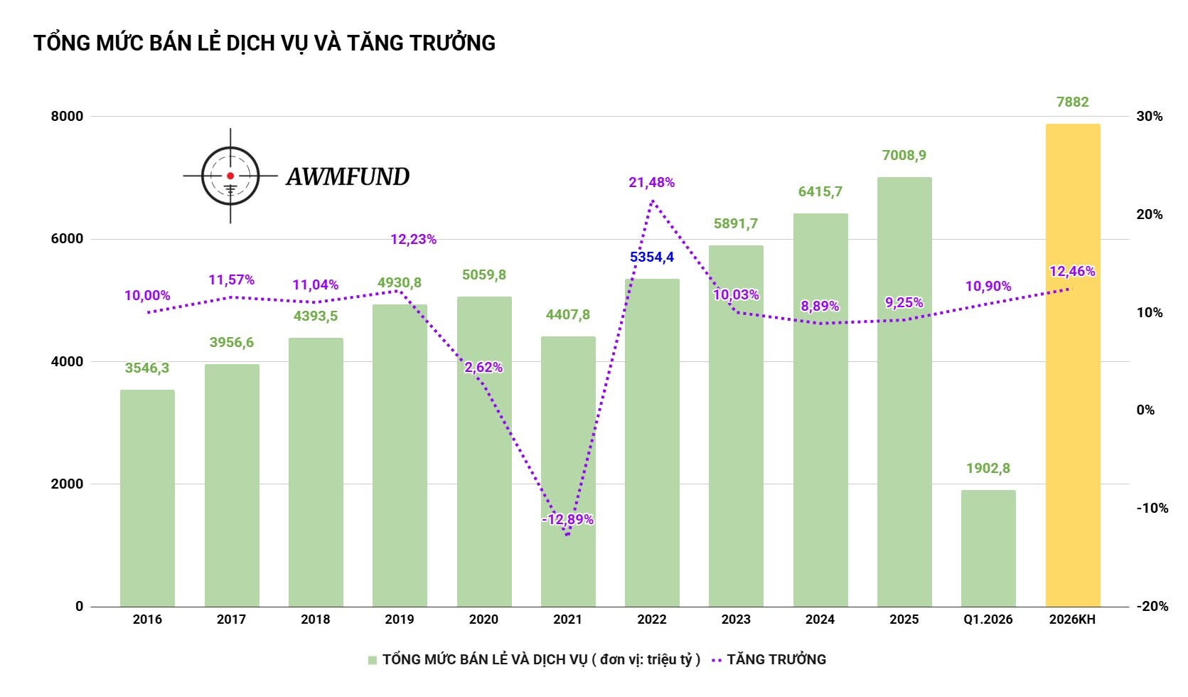 Tổng mức bán lẻ và tiêu dùng dịch vụ dự báo sẽ tăng trưởng 2 con số lên 7.88 triệu tỷ trong năm 2026, sẽ là mức tăng trưởng mạnh nhất trong nhiều năm trở lại đây.