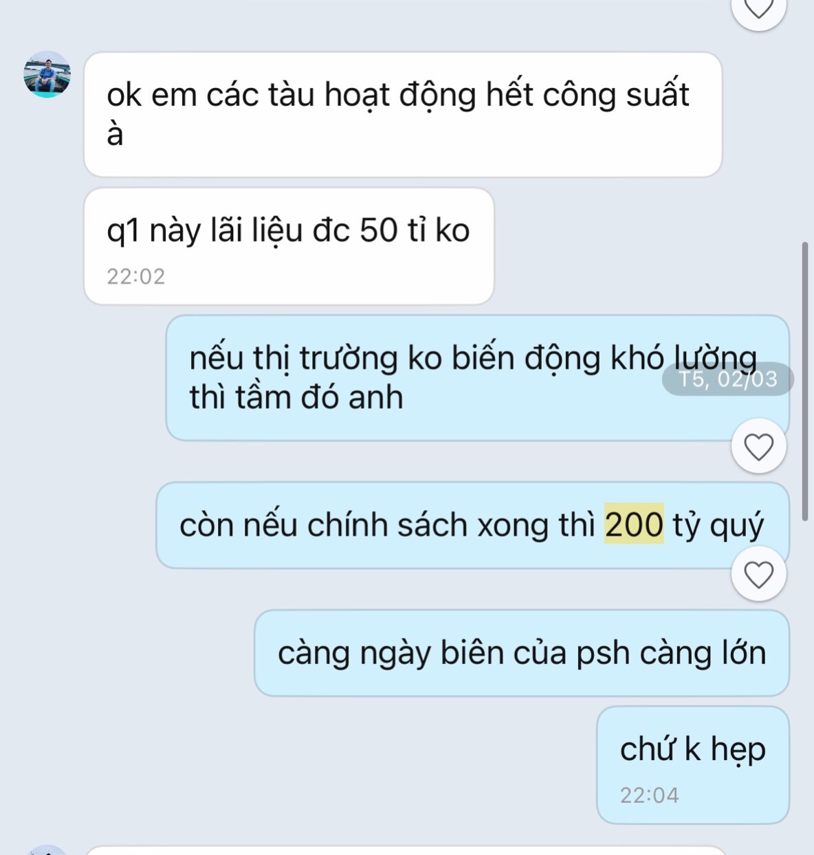 Cho ai còn lăn tăn về giá dầu giảm làm giảm lợi nhuận PSH. Có thể thấy con này lỗ nặng nhất quý 2 năm 2022 khi giá dầu đạt đỉnh. Quý 1 năm 2023 nhiều lần giá dầu chạm gần 70 nhưng kết quả kinh doanh sao mọi người biết rồi. Nói chung cho a e thấy cơ hội mà ăn thôi chú vài ba chú chim lợn chẳng làm thay đổi được giá cổ đâu.