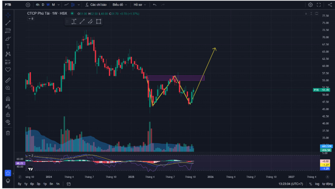 PTB đang bắt đầu có Dấu hiệu tạo đáy. Với kết quả kinh doanh bùng nổ trong quý 3, kỳ vọng giá cổ phiếu sẽ bức phá, nếu có thể vượt qua ngưỡng kháng cự 54-56 sẽ là 1 tín hiệu xác nhận mẫu hình 2 đáy.