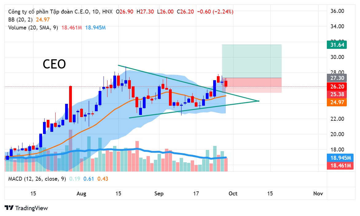 CEO đã tạo mẫu hình cái nêm với phiên break ngày 24/09, tạo ra điểm mua. Sau khi mua xong, giá chưa tăng ngay nhưng điểm tích cực là thanh khoản vào khá tốt, trong khi các phiên bán có thanh khoản thấp. Hiện tại, CEO vẫn giữ được cây nến tăng của ngày 24/09. Nhà đầu tư có thể tiếp tục nắm giữ, chờ thêm tín hiệu và cắt nếu chạm điểm cắt lỗ. Những cổ phiếu break gần đây như HHV và HDG cũng có mẫu hình khá giống CEO, và hành động giá cũng tương tự.