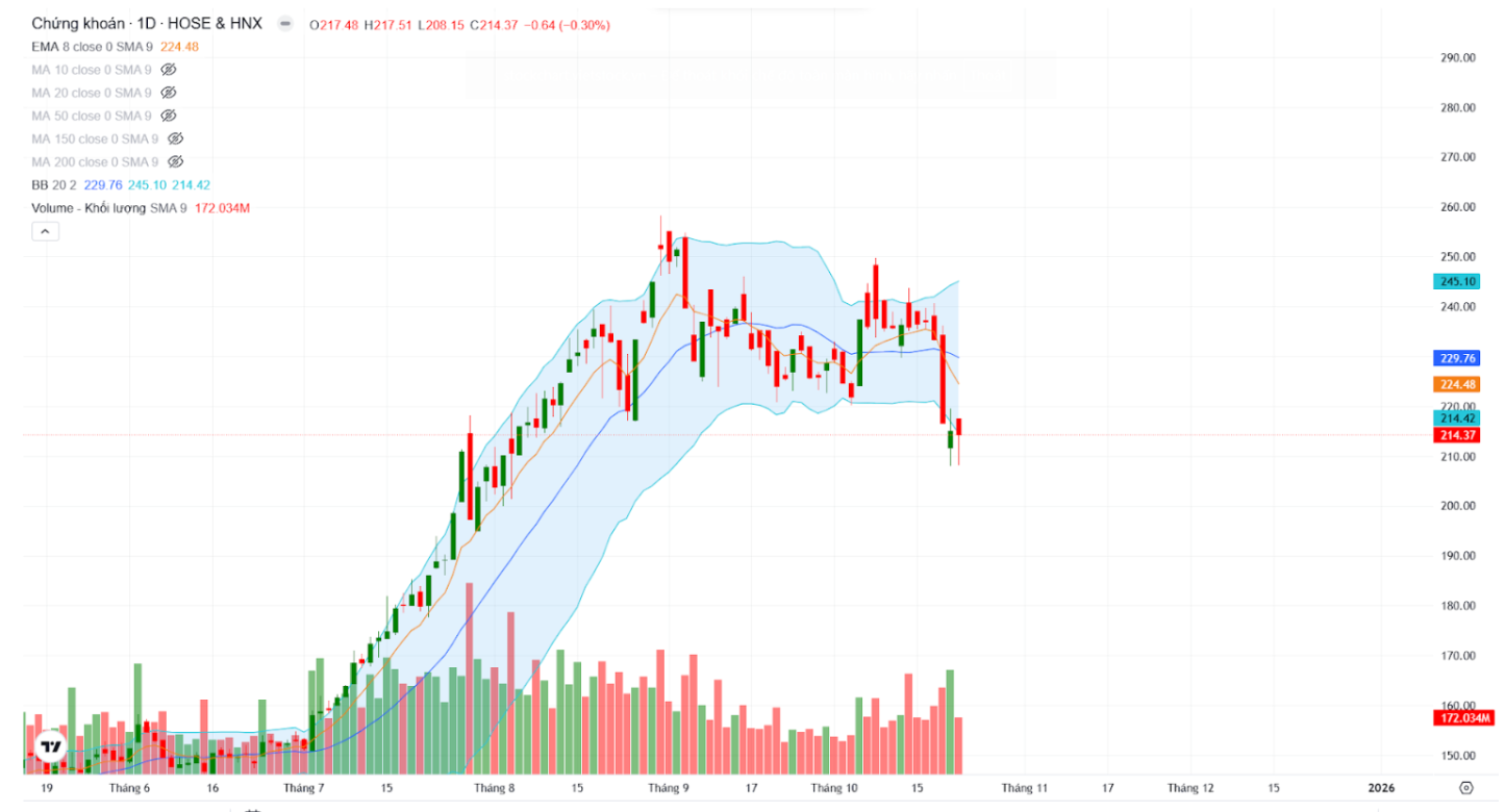 Nhóm Chứng khoán: Nến ngày đóng cửa, rút chân, có xu hướng quay trở lại vào trong dải Bollinger Band.