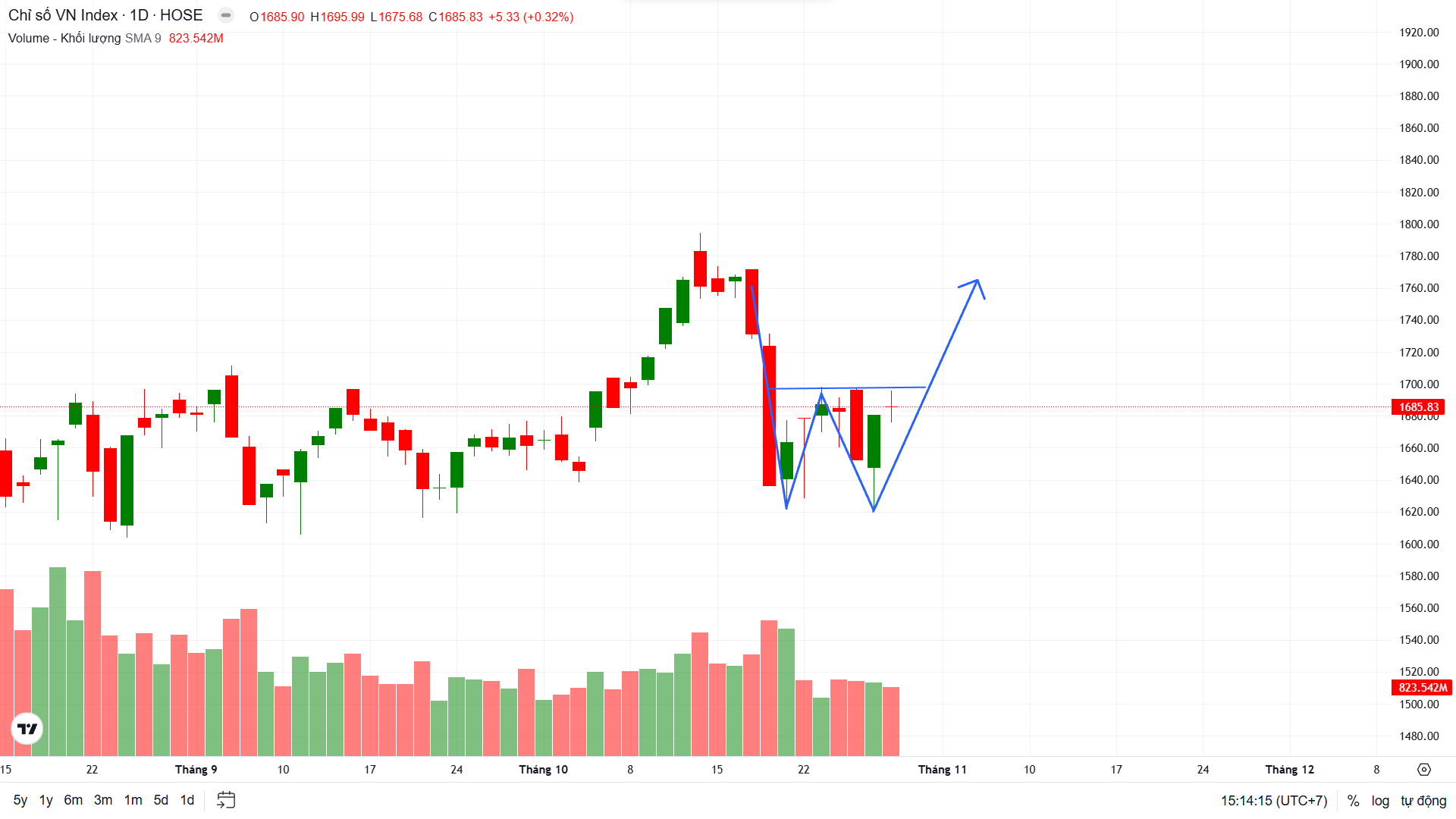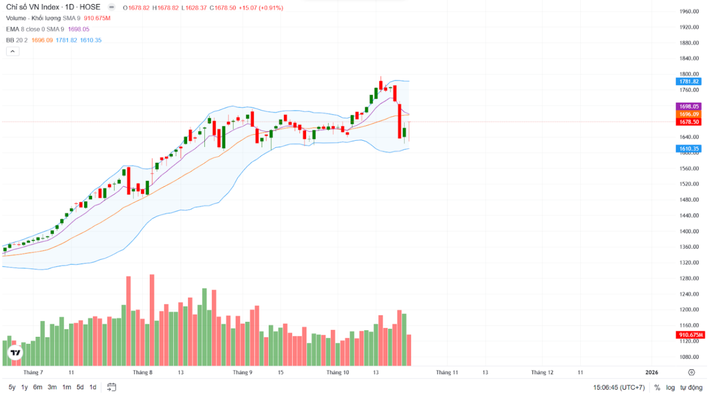 Kết thúc phiên ngày 22/10, VnIndex đóng cửa bằng cây nến Dragonfly Doji với 1,678.50đ (+15.07)