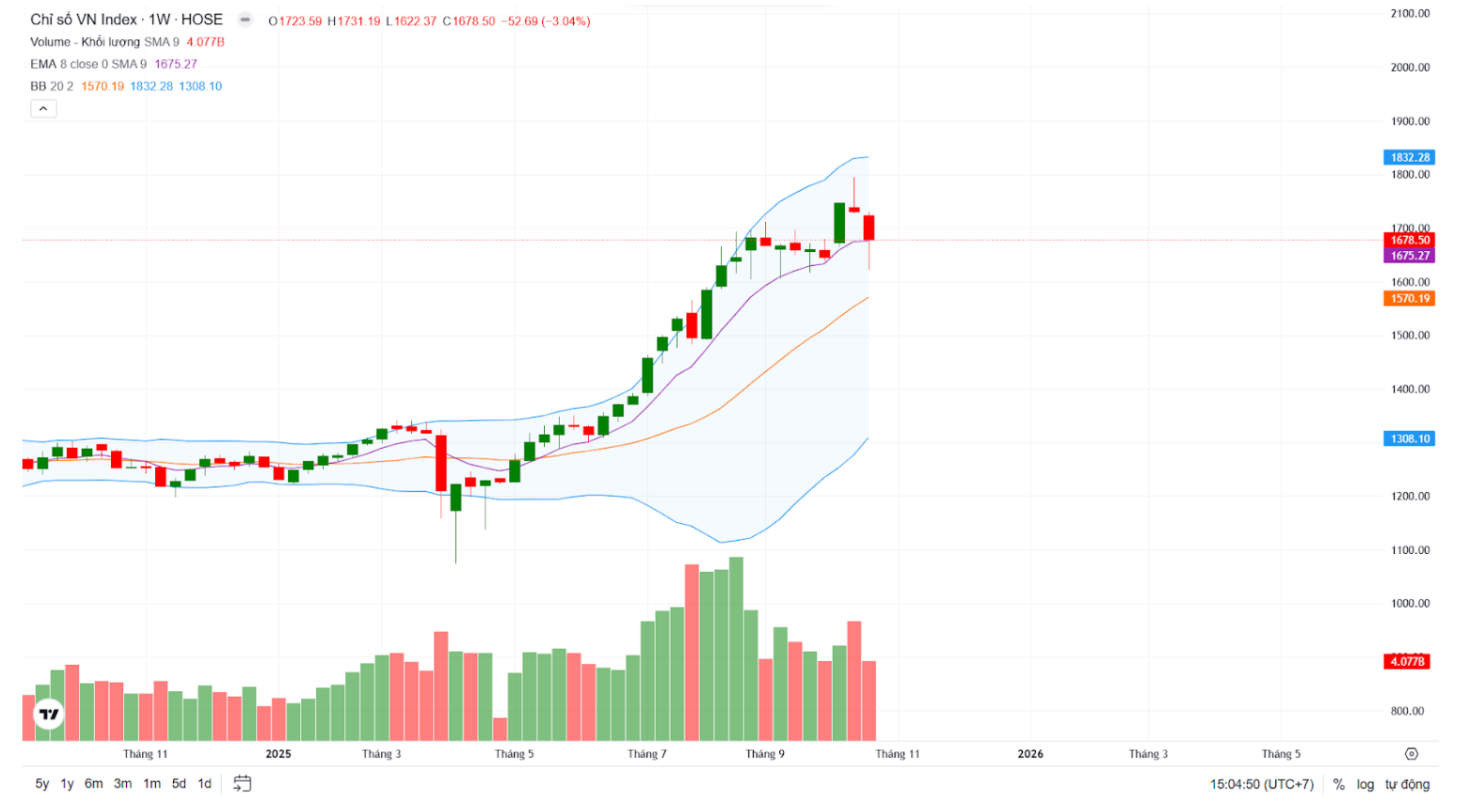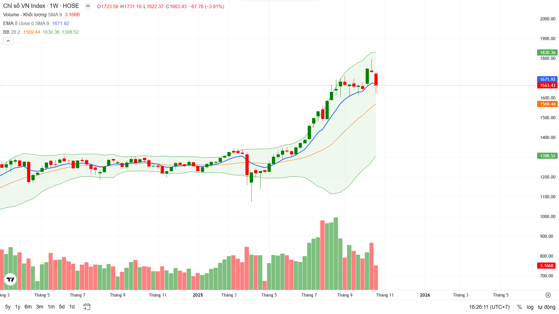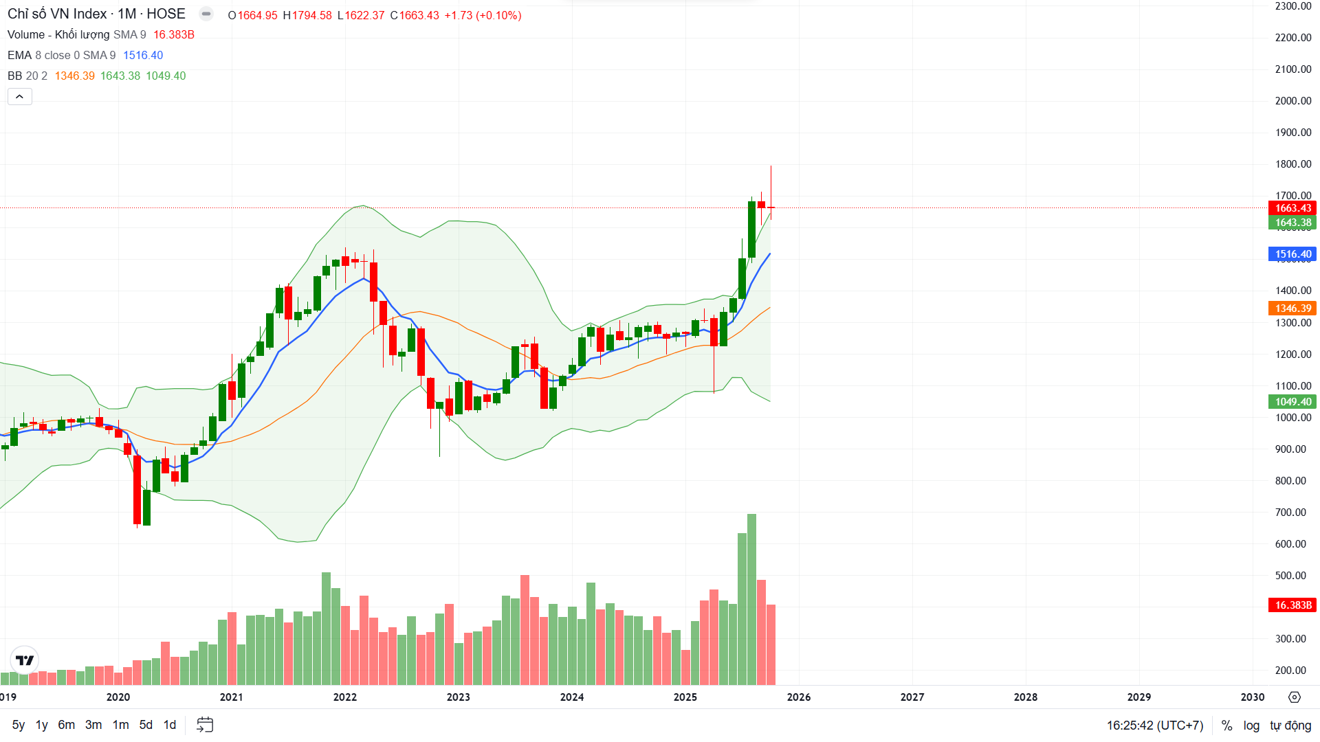 Chart Monthly: Cây nến tháng Doji tiếp tục nằm ở bên ngoài biên trên dãy bollinger band, nếu thủng vùng 1644 điểm thì có thể quay trở lại hỗ trợ ở EMA8, xêm xêm với vùng đỉnh cũ 2022 quanh 1550 điểm.