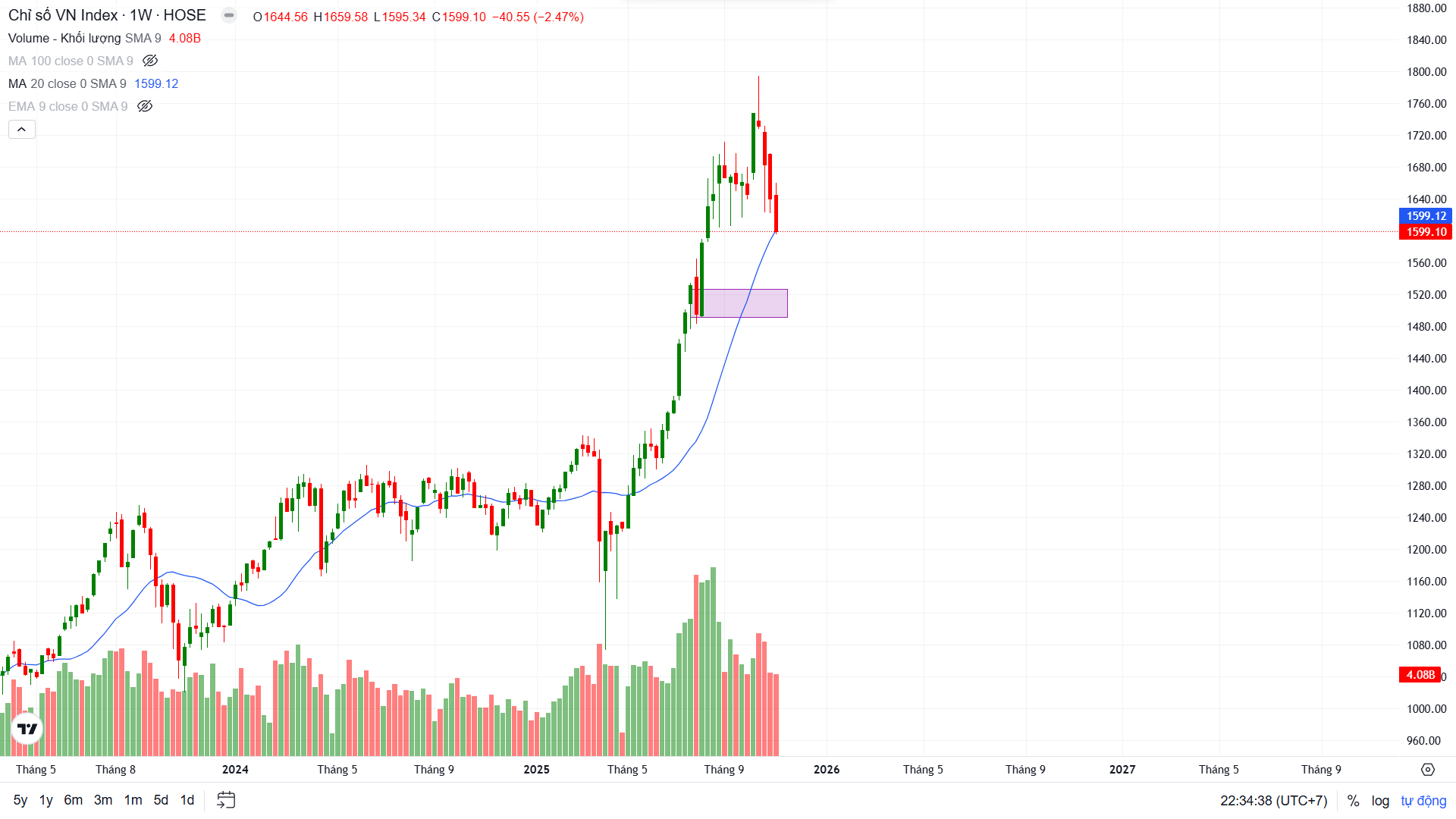 Trên Chart Weekly, VN-Index chạm hỗ trợ MA20, vùng hỗ trợ tiếp theo sẽ là vùng 1500-1520đ cũng chính là vùng đỉnh cũ 2022.