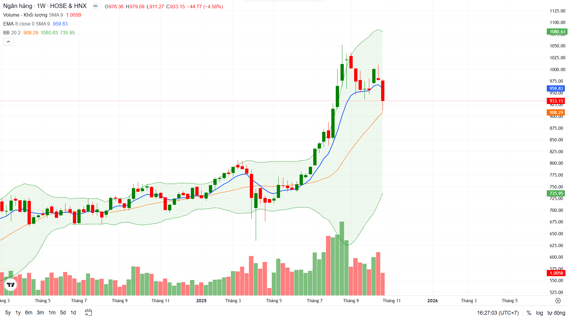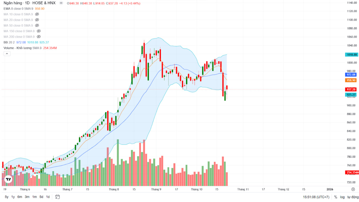 Nhóm Ngân hàng: cây nến ngày đóng cửa rút chân, quay lại bên trong dãy bollinger band.