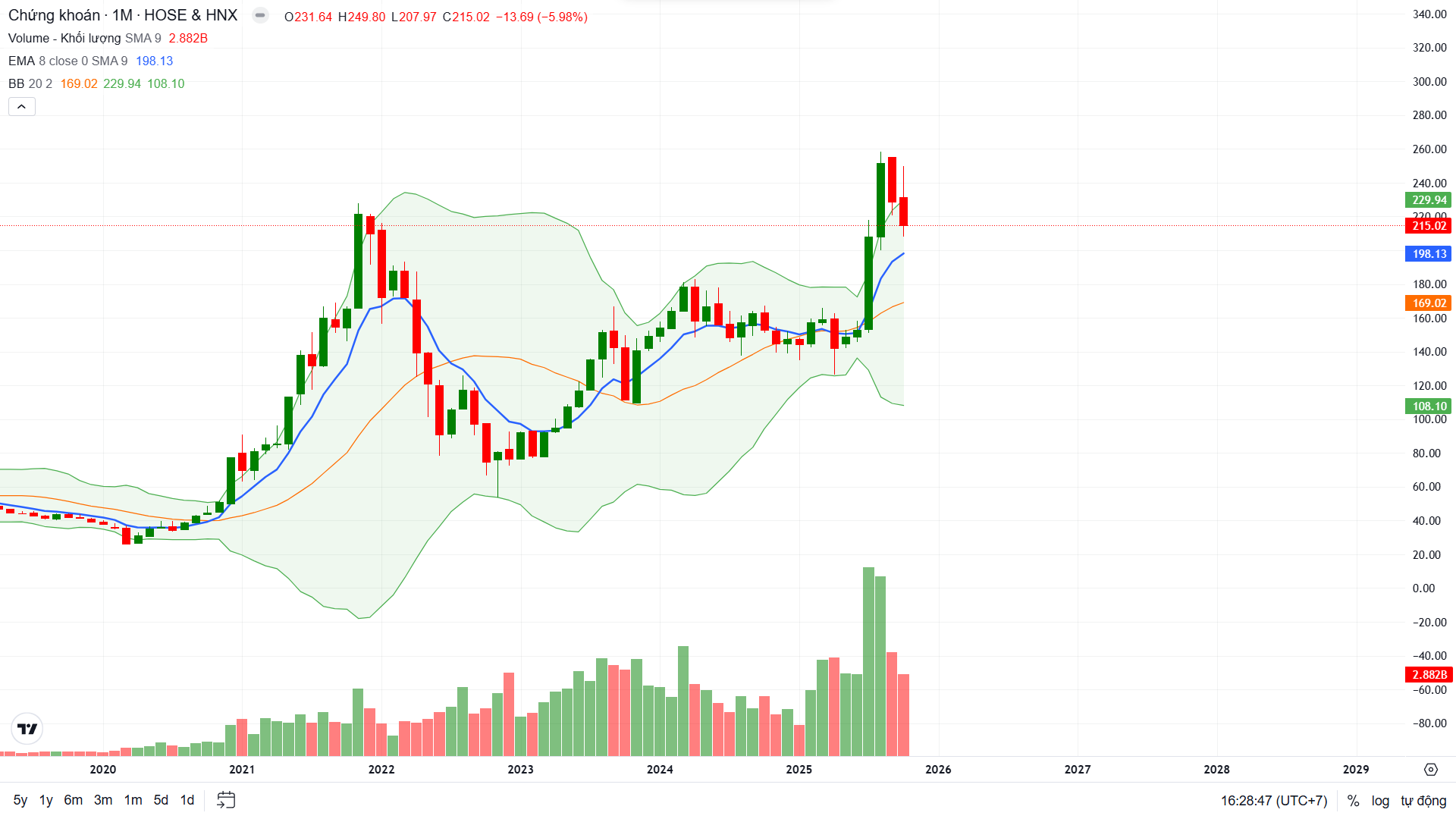 Chart Weekly và Monthly nhóm chứng khoán cũng tương tự nhóm Ngân hàng. Weekly cũng chạm MA20 và đang có phản ứng tích cực.
