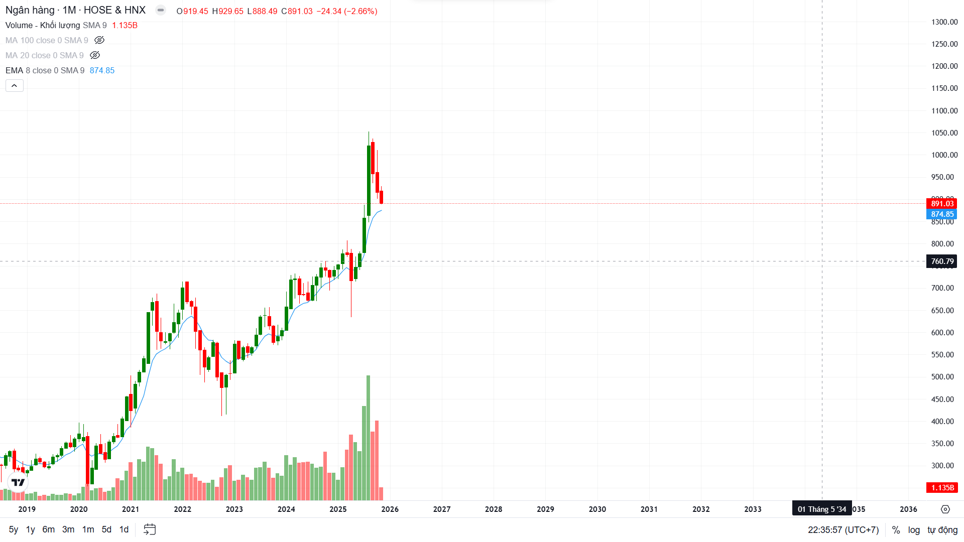 Chart Monthly nhóm ngành Ngân hàng, xuất hiện liên tiếp 3 cây nến đỏ, cách hỗ trợ EMA8 khoảng 1.6% . Giá sẽ có phản ứng tại vùng này, kỳ vọng xuất hiện nhịp hồi T+ tại đây