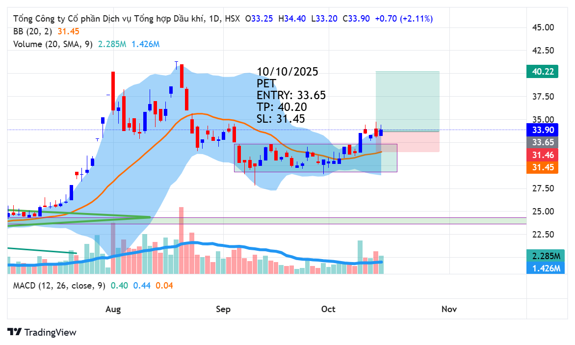 Sau khi hình thành hai đỉnh và giảm khoảng 32% từ vùng đỉnh về mức giá thấp nhất, PET đã tạo nền tích lũy trong khoảng một tháng. Nền giá này có biên độ dao động hẹp, thanh khoản thấp và dải Bollinger band được thu hẹp lại, cho thấy áp lực bán đã cạn và cổ phiếu đang trong giai đoạn nén giá. Đến ngày 9 tháng 10, PET có phiên tăng trần với thanh khoản gấp đôi trung bình 20 phiên, đánh dấu tín hiệu break khỏi nền tích lũy và mở dải Bollinger band đi lên. Với phiên break này, PET đã hình thành điểm mua mới, và mục tiêu giá trong ngắn hạn sẽ hướng về vùng đỉnh cũ.