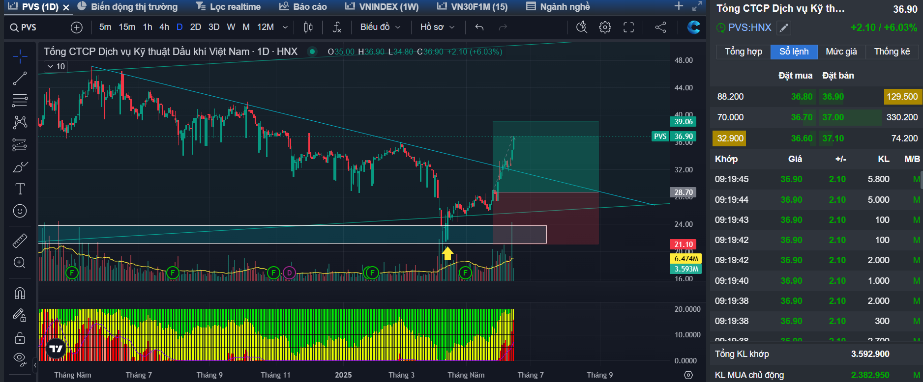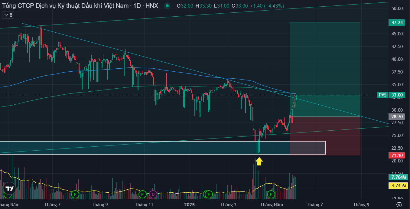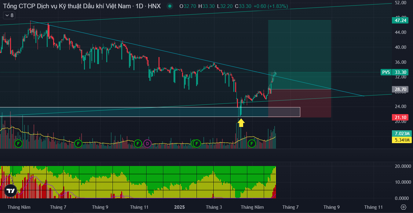 Về dài hạn: Nhìn rộng hơn một chút, PVS vẫn đang trong xu hướng tăng trưởng dài hạn với đỉnh sau cao hơn đỉnh trước, đáy sau cao hơn đáy trước.
