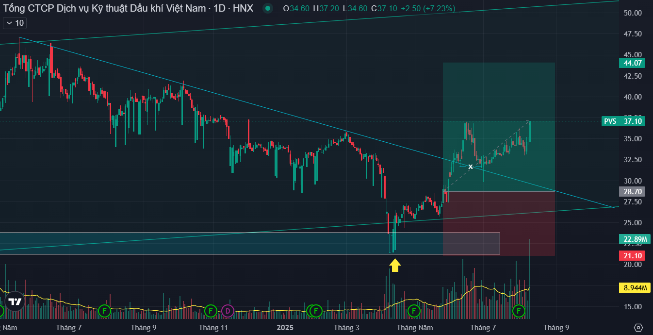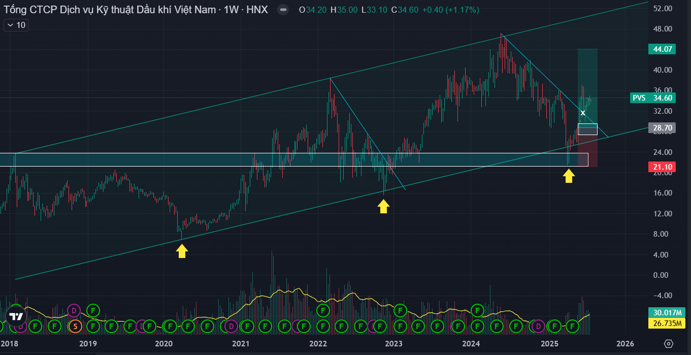 PVS cập nhật phân tích kỹ thuật: Đã tiếp cận hỗ trợ ngắn 31.7 - 33.7, đồng thời backtest lại đường EMA250 & EMA500 (đường trung bình giá 1 năm & 2 năm) có phản ứng giá rút chân, khung nhỏ đang cho tín hiệu đảo chiều tăng (chưa xác nhận).