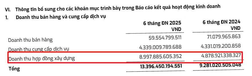 - Doanh thu thuần đạt 7.382,77 tỷ đồng (+35,5% YoY), trong đó doanh thu từ hợp đồng xây dựng tăng trưởng ấn tượng đạt 8.997,89 tỷ đồng (+84,4% YoY).