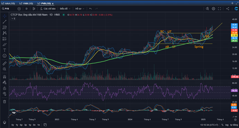 • Hiện tại PVB đang vận động trên 1 nền giá trên đỉnh đc lập năm 2022 tạo 1 nền giá tái tích lũy từ tháng 5 đến tháng 12/2024 vùng 26 đến 32 khá là chặt chẽ vùng đáy vol khá cạn kiệt. Hơn 1 tháng trở lại đây dòng tiền bắt đầu quay trở lại, nổi bật có phiên bùng nổ vol lớn vào ngày 10/1/2025.