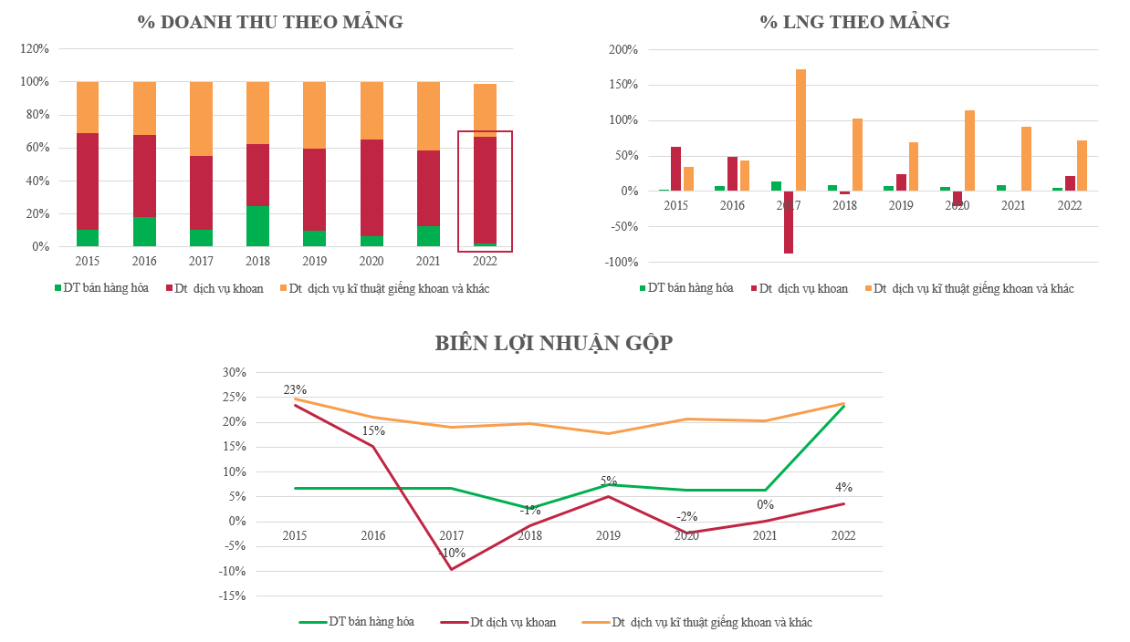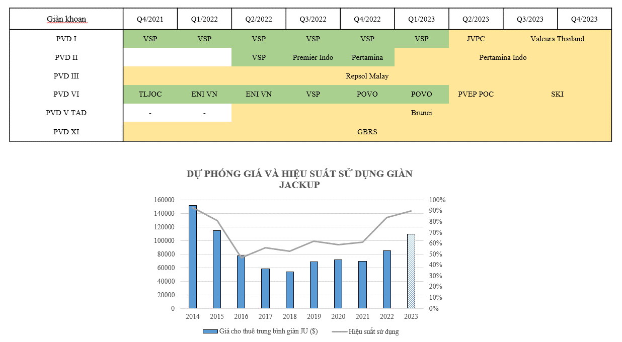 Với việc mảng dịch vụ khoan chiếm ~50% cơ cấu DT và LN đang được cải thiện do giá cho thuê giàn tự nâng liên tục tăng ở khu vực ĐNA(1) và thế giới và độ trễ lợi nhuận của các doanh nghiệp thượng nguồn rơi vào khoảng 6T - 1 năm thì