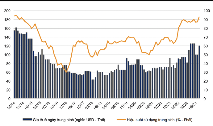 Điều này đã giúp giá thuê giàn JU tham chiếu tăng lên mức cao chưa từng thấy kể từ năm 2015 từ cuối năm 2022, dao động từ 95.000 USD đến 134.000 USD. Nhìn chung, em cho rằng giá thuê trung bình giàn JU tại ĐNÁ sẽ duy trì trên mức 120.000 USD trong thời gian tới nhờ nhu cầu tiếp tục tăng mạnh trong bối cảnh nguồn cung giàn bị thu hẹp và nguồn cung bổ sung từ giàn khoan mới khó có thể xảy ra trong ngắn hạn.