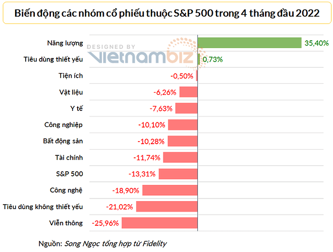 Thống kê dưới đây cho thấy chỉ số đại diện thị trường chứng khoán Mỹ là S&P 500 hiện thấp hơn 13,3% so với ngày đầu năm, hầu hết nhóm ngành đều chìm trong sắc đỏ. Tuy nhiên, riêng cổ phiếu ngành năng lượng tăng vọt hơn 35%.