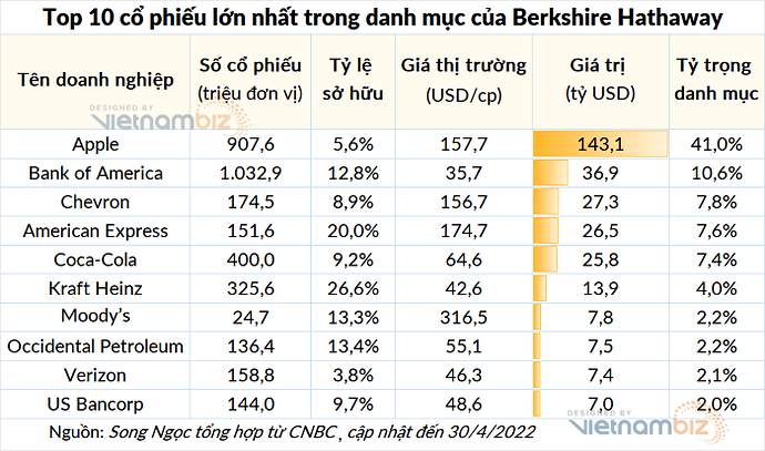 Tính đến ngày 29/4 vừa qua, số cổ phiếu Apple trong danh mục của Berkshire Hathaway có giá trị 143 tỷ USD, con số với Bank of America là 36,9 tỷ USD.
