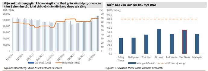Nguyên nhân chính giúp thị trường khoan phục hồi là do nhu cầu đối với giàn khoan Jack-up từ Trung Đông cao hơn, theo đó, các giàn khoan stacked trước đó ở Đông Nam Á được chuyển đến Trung Đông cho các chiến dịch khoan vào năm 2023-2024, trong khi nguồn cung khan hiếm do lượng giàn đặt đóng mới thấp, như chúng tôi cũng đã cập nhật trong các báo cáo trước đây về PVD. Hiện tại, giá thuê giàn jack-up cho các hợp đồng mới dao động trong khoảng 100-125 nghìn USD/ngày ở khu vực Đông Nam Á. Tuy nhiên, theo ban lãnh đạo, nhiều hợp đồng đã được ký trong năm 2022 với mức giá thuê thấp hơn. Do đó, giá thuê trung bình trong năm 2023 có thể thấp hơn mức giá thị trường hiện tại và ở PVD cũng như vậy. Tuy nhiên, so với năm 2022, giá cho thuê của PVD trong năm 2023 cao hơn 20% svck, tương đương 75 nghìn USD/ngày (gần với mức giả định hiện tại của chúng tôi). Một điểm tích cực khác là công suất hoạt động cao hơn và thời hạn hợp đồng dài hơn, cùng với một số hợp đồng được ký với thời hạn dài tới 1-2 năm.