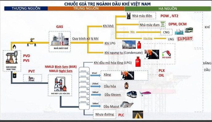 Các công ty trong ngành dầu khí Việt Nam tham gia vào tất cả các khâu từ thượng nguồn (khai thác, thăm dò) đến hạ nguồn (chế biến, phân phối). Dầu thô và khí ẩm là nguyên liệu thô được khai thác ngoài khơi đưa về chế biến trong đất liền và đưa đi phân phối đến khách hàng.