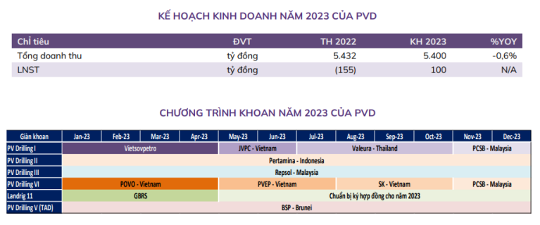 Ban lãnh đạo kỳ vọng năm 2023 sẽ là năm bắt đầu một chu kỳ tăng trưởng mới của PVD sau giai đoạn khó khăn vừa qua. Ban lãnh đạo cho rằng giá dầu thô sẽ duy trì ở mức cao trong giai đoạn 2023-2025, điều này hỗ trợ hoạt động thăm dò & khai thác trên toàn cầu. Ngoài ra, giá dầu thô cao sẽ hỗ trợ thực hiện các chiến dịch khoan dài hạn cho các mỏ dầu thô và mỏ khí tại Việt Nam như Sư Tử Trắng – Giai đoạn 2B và Lô B. Bên cạnh nhu cầu khoan phục hồi, ban lãnh đạo kỳ vọng thị trường khoan toàn cầu sẽ tiếp tục thắt chặt do số lượng giàn hạn chế. Cụ thể, PVD kỳ vọng giá cho thuê giàn khoan tại Đông Nam Á sẽ đạt 120.000-140.000 USD vào cuối năm 2023.