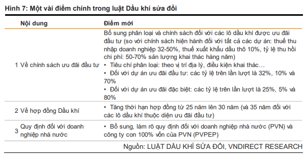 - Việc Luật Dầu Khí (sửa đổi) thông qua được đánh giá tích cực trong bối cảnh sản lượng khai thác ở các mỏ hiện hữu đang suy giảm 5-8%/năm do ảnh hưởng của thời gian khai thác (như Bạch Hổ, cụm mỏ Sư Tử, Tê Giác Trắng, Lan Tây…)., trong khi đó gia tăng trữ lượng trung bình giai đoạn này chỉ khoảng 12,6 triệu tấn/năm (tương đương 55% sản lượng đang khai thác). Cụ thể, quá trình phê duyệt và triển khai các dự án lớn được kỳ vọng sẽ rút ngắn lại đáng kể, cùng với việc tăng thêm cơ chế hỗ trợ nhằm thu hút dòng vốn đầu tư vào các dự án thượng nguồn. Gần đây, dự án lô B Ô Môn (tổng vốn đầu tư dự kiến 6,7 tỷ USD cho phần thượng nguồn) đã phát đi nhiều tín hiệu tích cực và hiệu ứng lan tỏa tới các doanh nghiệp trung nguồn thông qua hoạt động truyền dẫn và phân phối trong trung hạn.