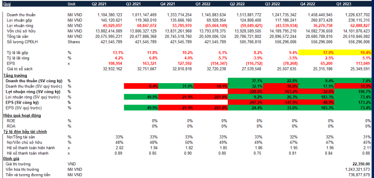 – KQKD Quý 1/2023 doanh thu tăng nhẹ so với cùng kỳ tuy nhiên lại giảm so với Quý 4/2022, điểm tích cực là lợi nhuận tăng trưởng mạnh so với cùng kỳ lỗ, và tăng gấp đôi so với Quý 4/2022.