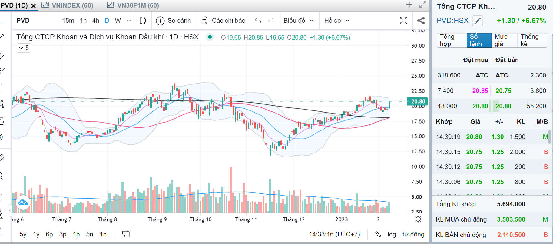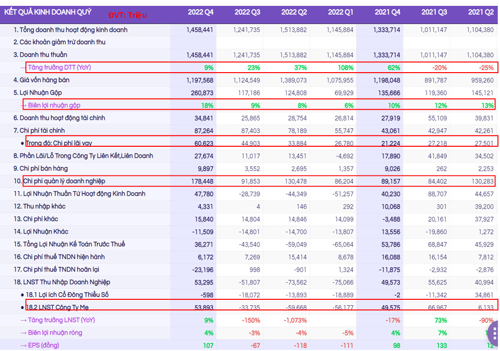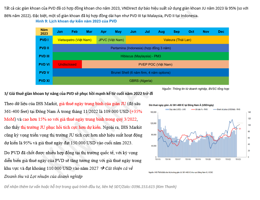 Trong Q4.2022 PVD lần lượt đạt DTT và LNST là 1,458 tỷ (+9% YoY) và 53,8 tỷ (+9% YoY), đây là quý duy nhất trong năm 2022 PVD ghi nhận LNST dương sau 3 quý âm liên tục. Biên lợi nhuận gộp cũng có sự cải thiện đáng kể so với cùng kỳ và so với quý trước, lên mức 18%. Tính cả năm 2022 thì DTT và LNDT của PVD đạt 5,359 tỷ (+34,1% YoY) và -95,7 tỷ.