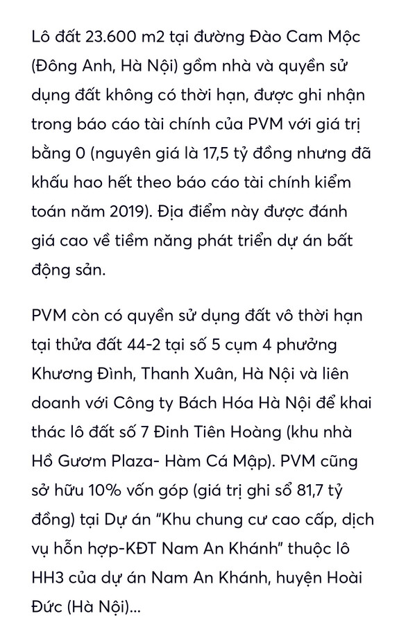 Con PVM là ngon nhất họ dầu khí: Lợi nhuận tăng trưởng 8 năm liên tiếp. Từ sau khi nhà nước thoái vốn, công ty đã đẩy mạnh việc cải thiện quản trị, tinh gọn bộ máy, giảm chi phí quản lý doanh nghiệp. Ngoài ra PVM nổi tiếng nắm giữ nhiều đất vàng, ví dụ như lô đất 1827 m2 ở số 8 Tràng Thi (Quận Hoàn Kiếm), lô đất 23600 m2 ở đường Đào Cam Mộc (Đông Anh) và nhiều lô đất khác…