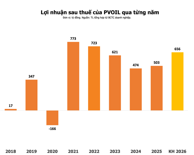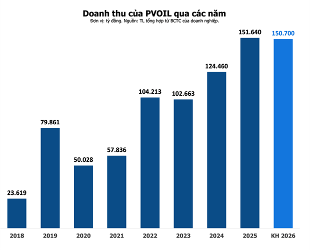 Năm 2026, PVOIL dự kiến doanh thu giảm nhẹ so với năm 2025, trong khi lợi nhuận sau thuế dự kiến tăng 30% so với cùng kỳ.