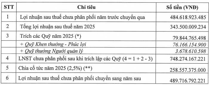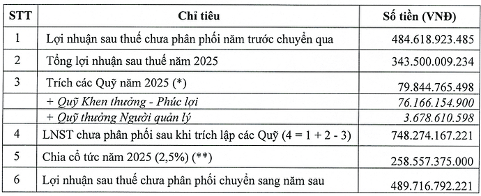 Về phân phối lợi nhuận, Hội đồng quản trị (HĐQT) trình cổ đông mức cổ tức 2,5% (tương đương số tiền 259 tỷ) và trích gần 80 tỷ đồng vào quỹ khen thưởng, phúc lợi. Lợi nhuận sau thuế chưa phân phối chuyển sang năm sau dự kiến còn khoảng 490 tỷ đồng.