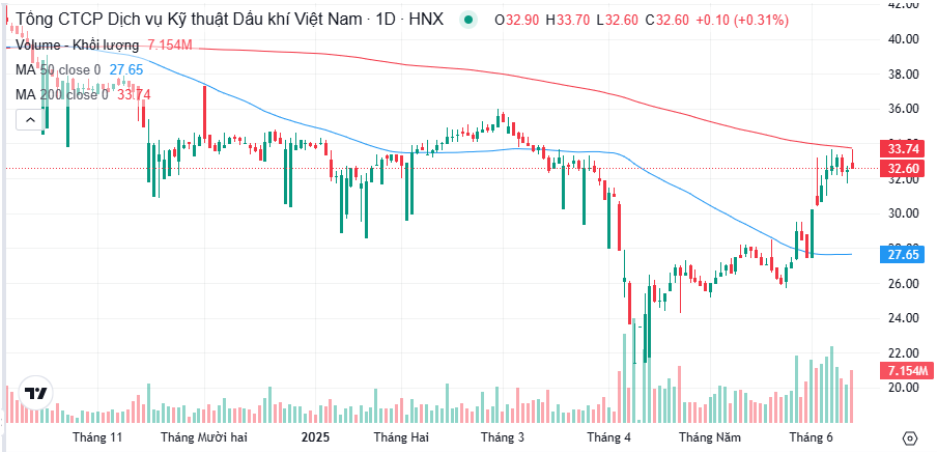 Xét về kỹ thuật, PVS đã tăng mạnh từ đáy tháng 4 và chính thức bứt tốc từ phiên 02/06 vừa qua. Hiện tại, sau pha tăng mạnh thì PVS đang nghỉ chân, chờ tích lũy để vượt qua MA200 - một mốc cản tâm lý khá lớn. Chúng tôi tin rằng PVS hoàn toàn có khả năng tăng khoảng 10% nữa trước khi điều chỉnh - tương đương đỉnh cũ khoảng giá 36 bởi doanh nghiệp này không bị ảnh hưởng bởi thuế quan mà vẫn chưa vượt đỉnh cũ. Nhà đầu tư ngắn hạn có thể tìm điểm chốt lời phù hợp quanh vùng giá này. Nhà đầu tư dài hạn có thể yên tâm nắm giữ và gia tăng khối lượng quanh những nhịp điều chỉnh.