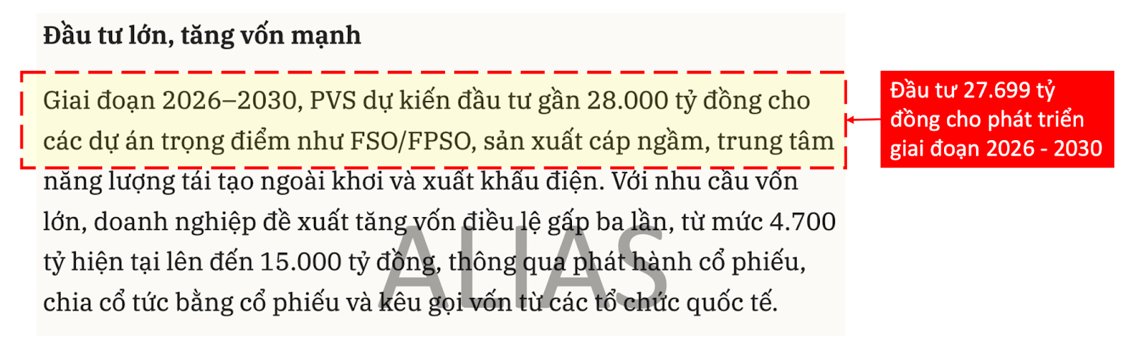 Tại ĐHĐCĐ 2025, PVS đặt mục tiêu đầu tư rất lớn trong giai đoạn 2026 – 2030 với giá trị 27.699 tỷ đồng, như góp vốn FSO/FPSO, sản xuất cáp ngầm, xuất khẩu điện, dịch vụ LNG sang Singapore, trung tâm năng lượng tái tạo ngoài khơi…